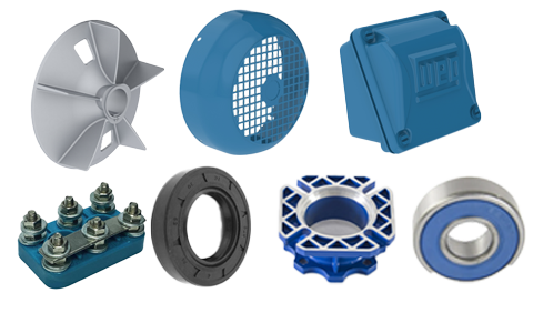 Ventiladores, tapas, rodamientos, bridas, borneras, cajas de conexiones, sellos, acoples, etc.